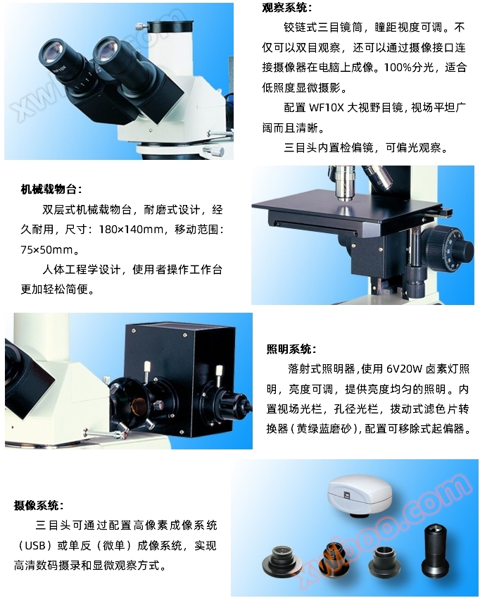 Барто®БММ-300Серія позиційних металофазних мікроскопів призначена для мікроспостереження за непрозорими об'єктами. Цей інструмент налаштований з падаючим освітленням, обєктами з розкольоруванням плоского поля на довгу відстань(Без кришки)Окуляри великого поля зору та вбудовані пристрої для спостереження за поляризацією, які мають чітке зображення, хорошу підкладку, зручну роботу та інші особливості, триокуляр може не тільки візуально спостерігати, але також може здійснити спостереження, захоплення та інші функції за допомогою підключення камери на комп'ютері, це ідеальний інструмент для металогії, мінералогії, точної інженерії, електроніки та інших досліджень. Ідеально підходить для використання в школах, наукових дослідженнях, заводах та інших секторах.